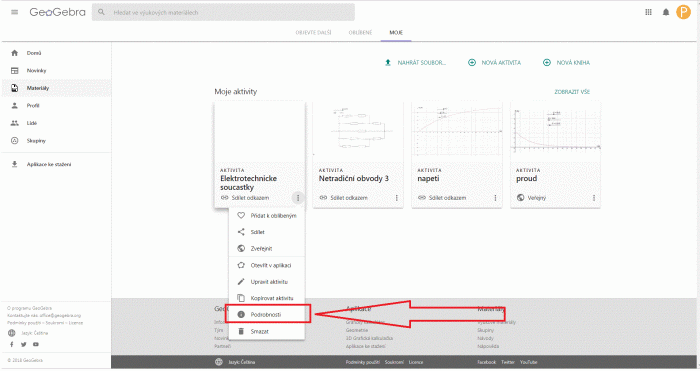 - Kliknutím na Materiály > Moje > Nahrát soubor, nahrajeme objekt na server. Vytvoří se něco jako pracovní list s tímto jediným objektem. Vyplníme název (nahoře), případně klíčová slova, a přístupnost nastavíme na „Sdílet odkazem“. Můžeme zde také zkusit změnit velikost objektu, pokud je třeba.